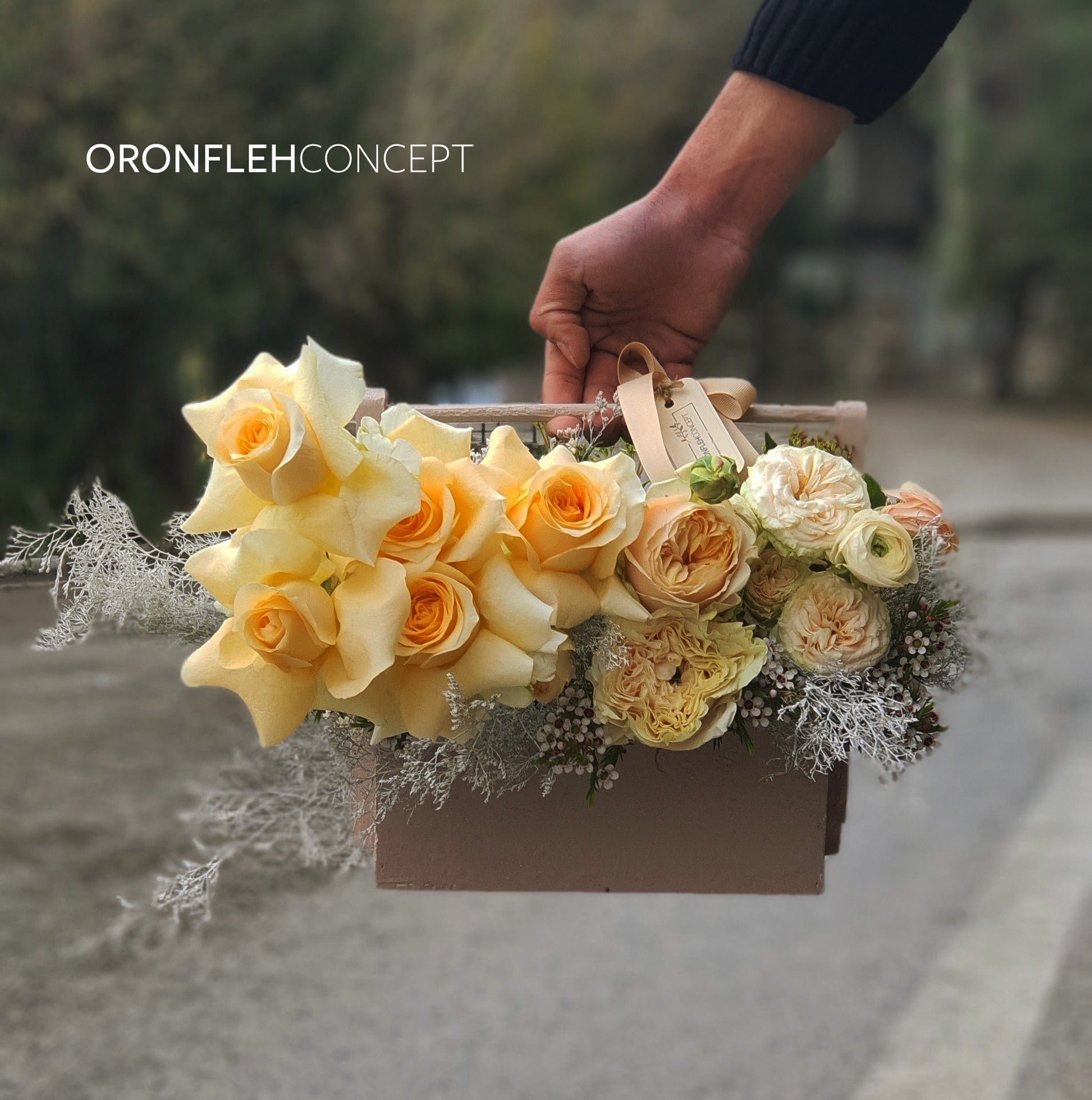 A fresh Flower Basket consisting of Peach yellow Roses, English Roses, Dried flowers , English Roses & White butterfly Roses.