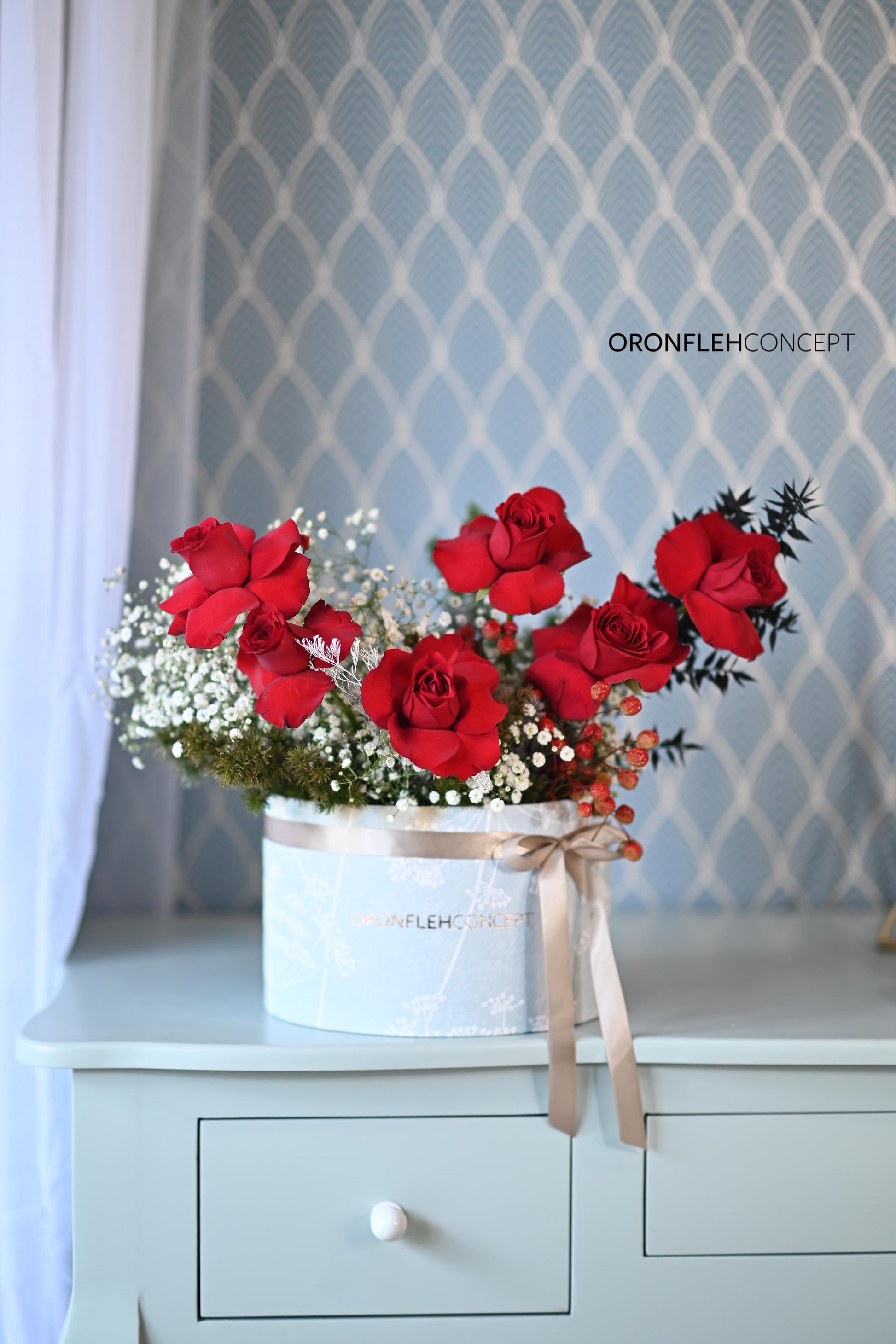 Special VALENTINE'S Oronfleh Concept box consisting of Red Roses, Gypsophilia, Dried Flowers & Black Ruscus.