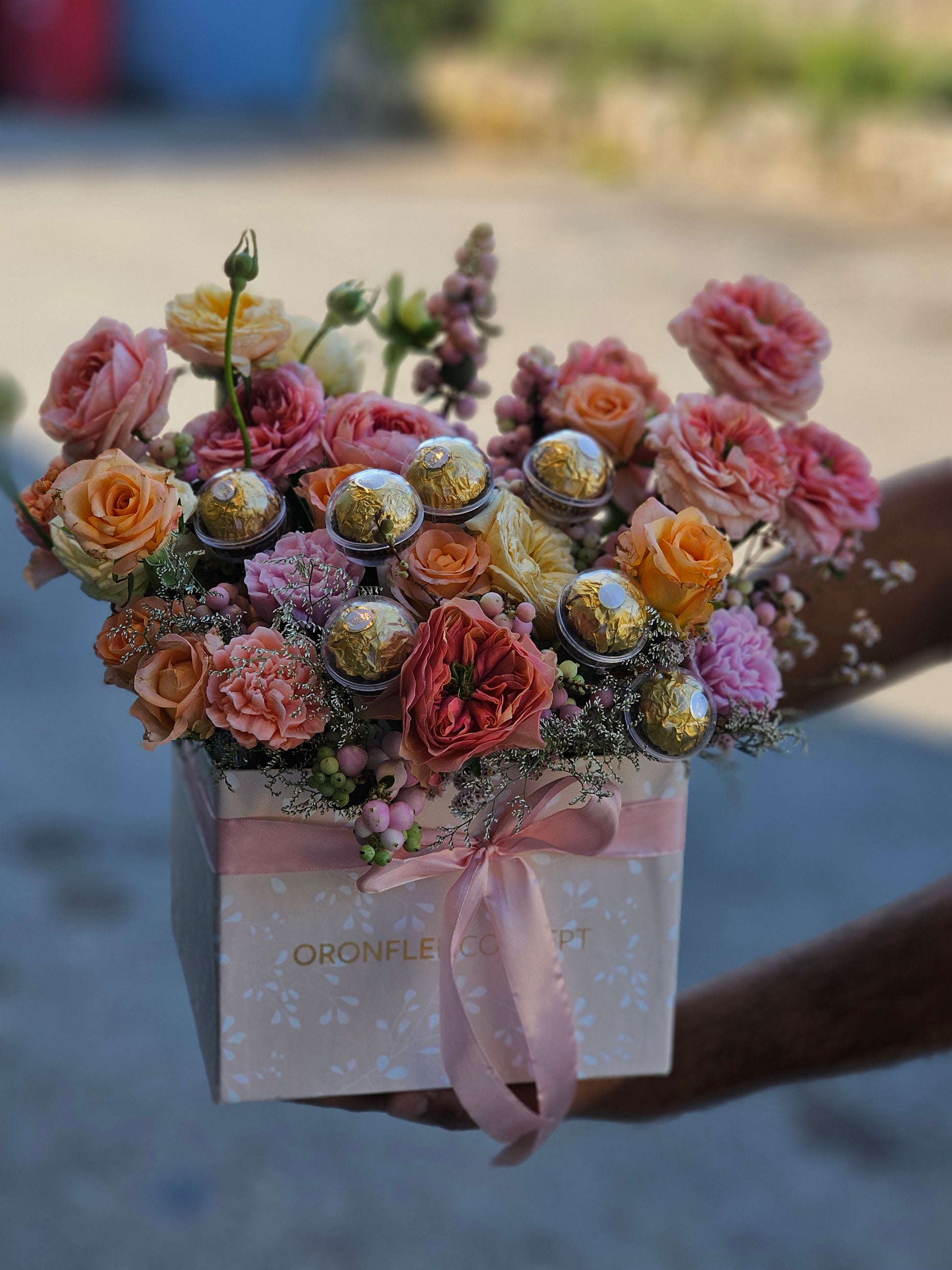 Colorful Flower Arrangement in our Oronfleh Concept box consisting of Roses, Baby Roses, ,English Rose & eucalyptus with 4 sented candles & Ferrero Chocolate