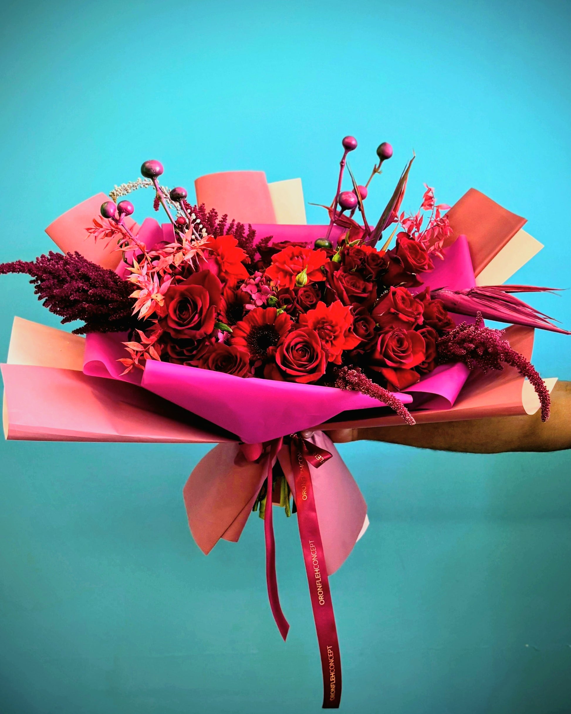 Our Red Rose Bouquet, wrapped in luxurious fuchsia and deep red tones, is a timeless symbol of love and passion. Each velvety rose is carefully selected for its rich color and full bloom, creating a striking contrast against the vibrant wrapping. Perfect for romantic gestures, anniversaries, or any moment that deserves a touch of elegance.
