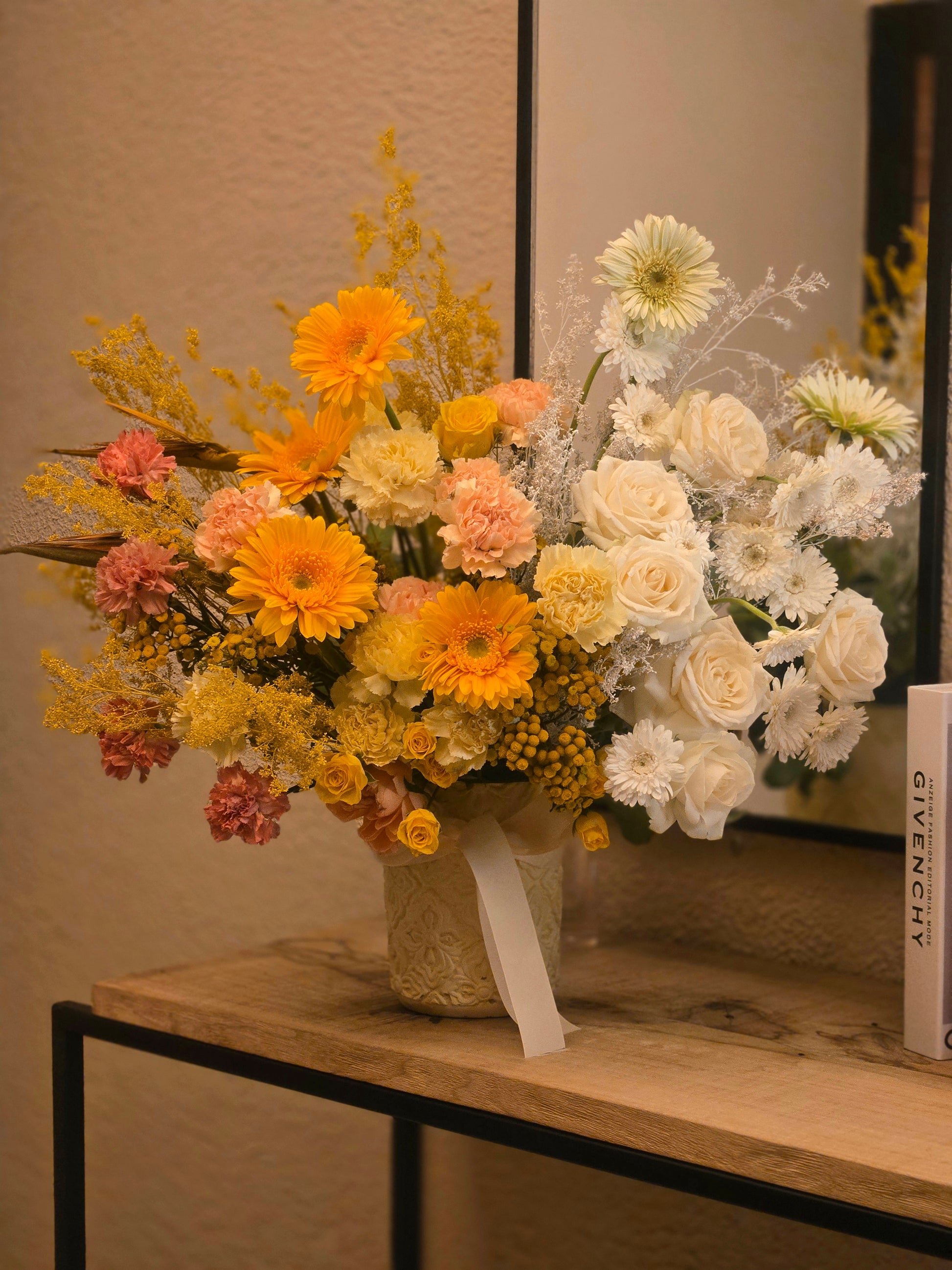 This elegant floral arrangement exudes warmth and sophistication, featuring a harmonious blend of sunshine yellow gerberas, creamy roses, soft peach carnations, and delicate white blooms. Accented with sprigs of golden solidago and airy fillers, the bouquet creates a radiant yet refined composition. Arranged in a textured ivory vase adorned with a satin ribbon, it brings a cheerful yet graceful touch to any interior — perfect for brightening spaces with a sense of timeless charm and natural beauty.