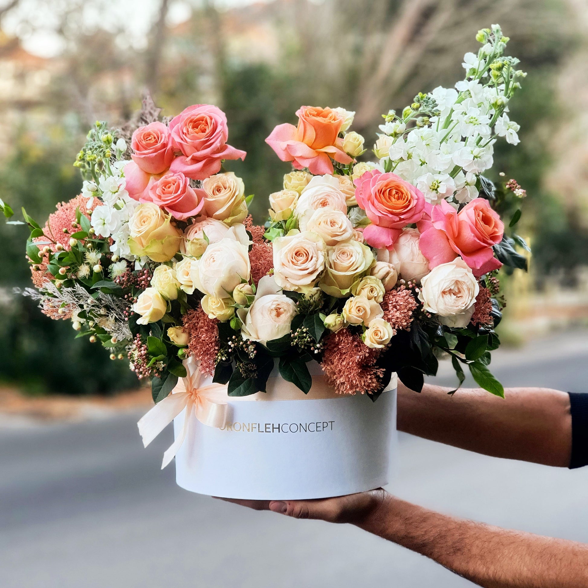 White & peach Flower Arrangement in our Oronfleh Concept White box consisting of White & Peach Roses, Ranunculus,Wallflower, English Roses, Baby Roses, Green Viburnum & Dried Limonium.