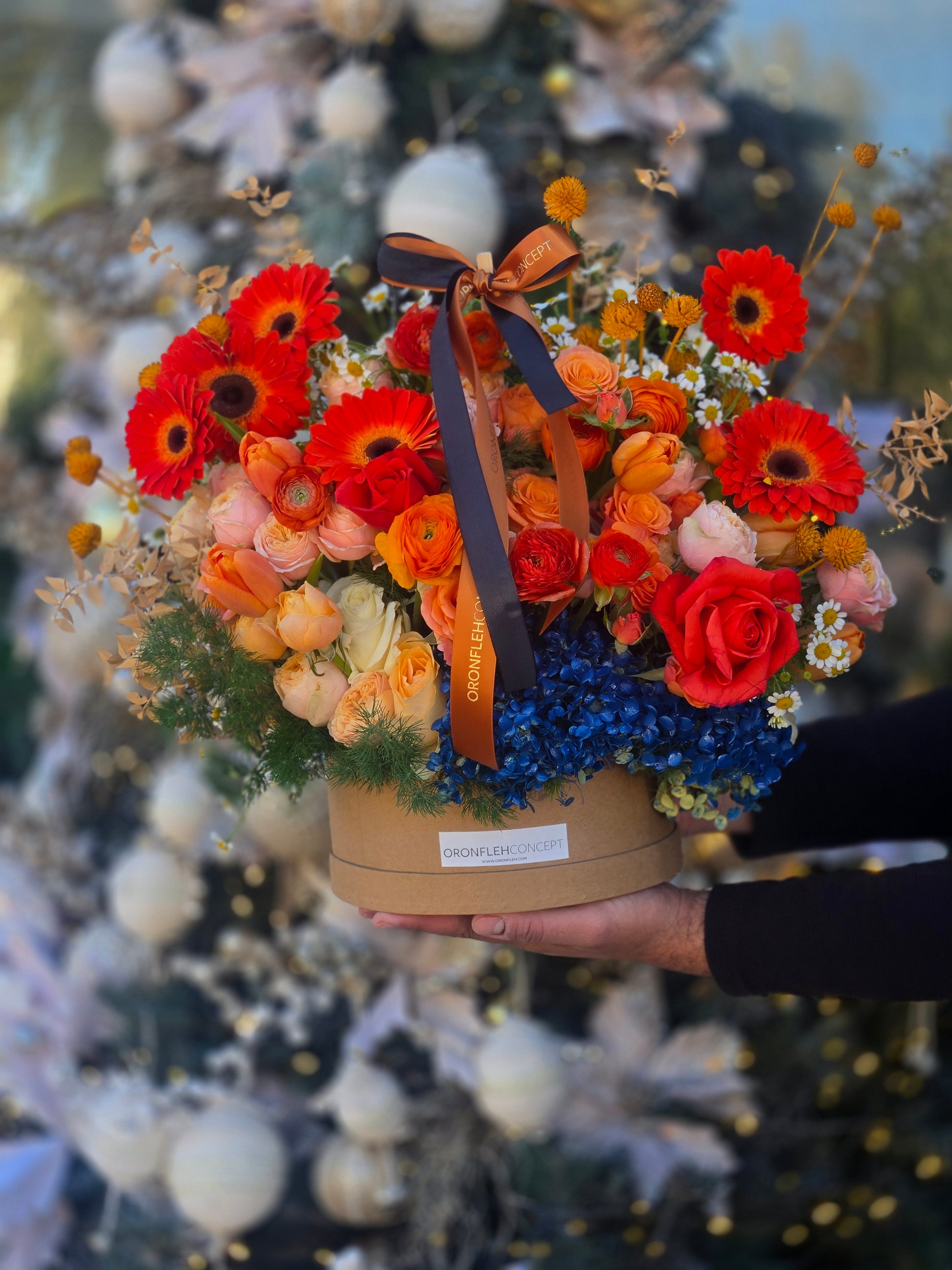 A vibrant harmony of warm orange accented with deep blue touches, beautifully arranged to capture the cozy glow and elegance of the autumn/winter season.