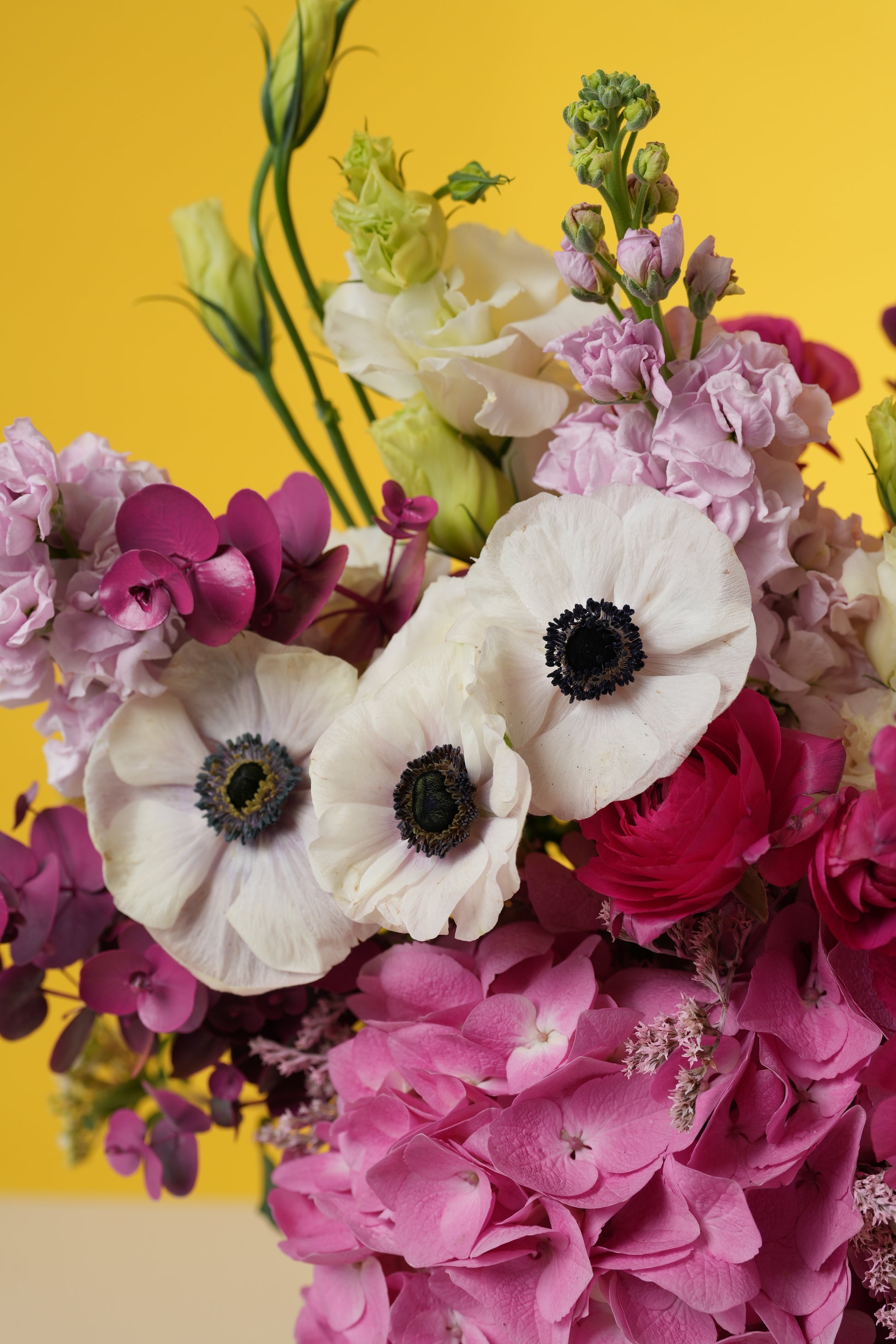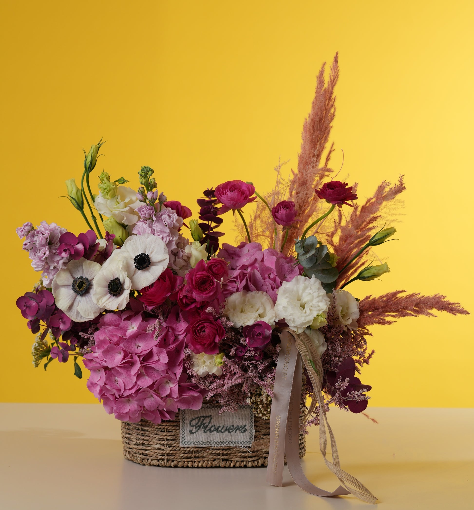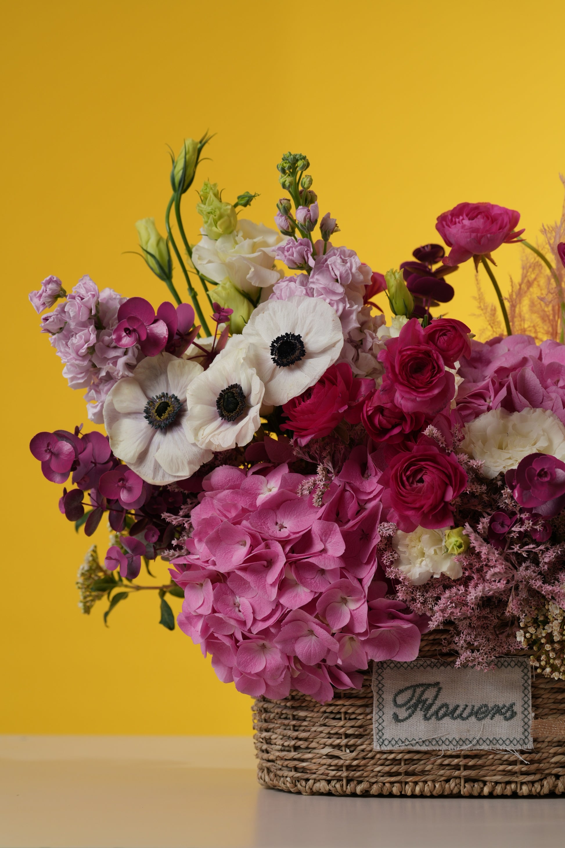Bring the charm of a blooming countryside meadow to her doorstep with this lush, textured basket. This arrangement is a stunning celebration of rich berry tones and delicate pastels, featuring a luxurious mix of deep pink hydrangeas, striking white-and-black anemones, and velvet ranunculus.