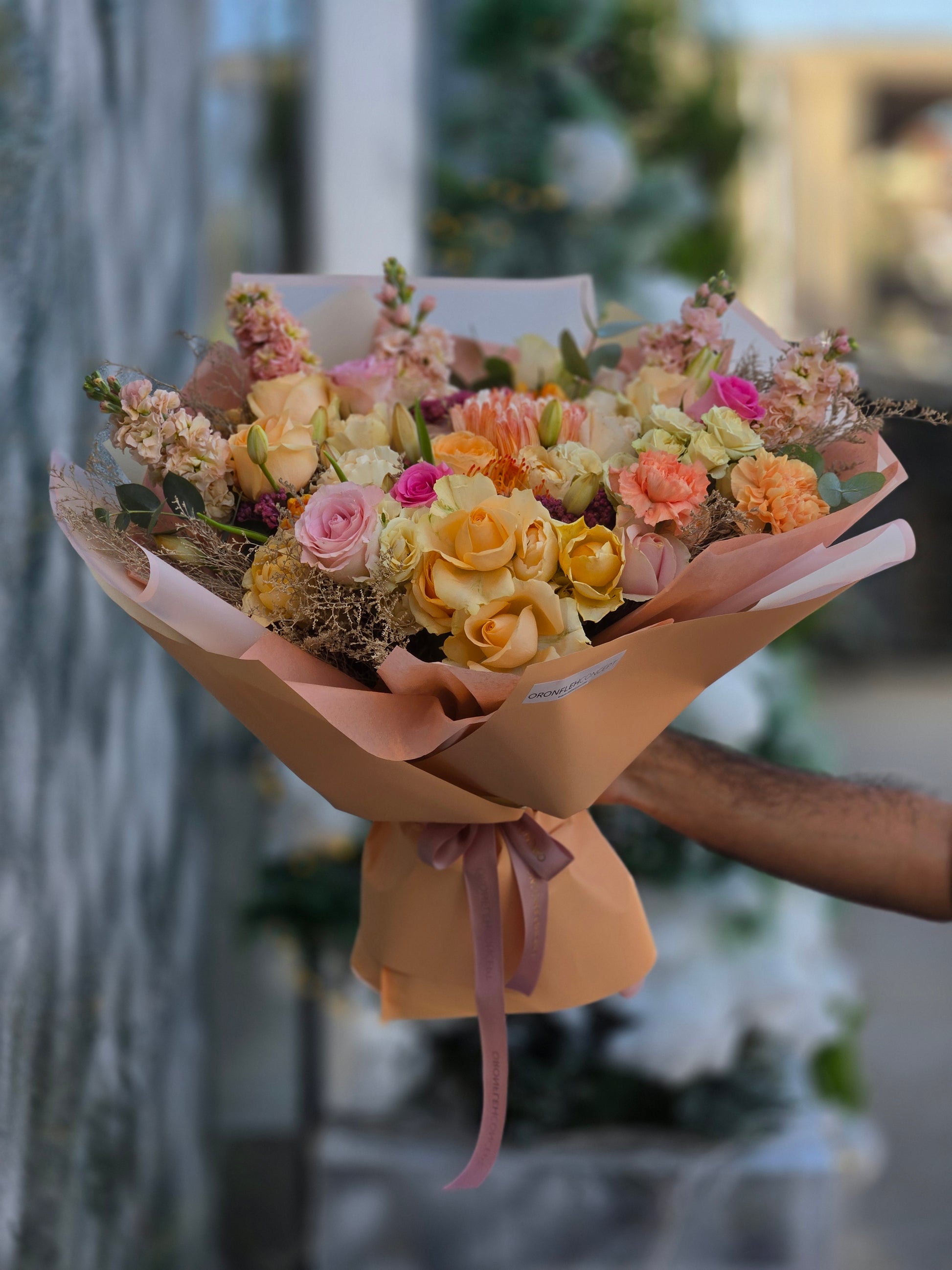 A charming bouquet of soft pink and creamy yellow roses, elegantly wrapped in rich shades of blush. This romantic arrangement is perfect for celebrating love, joy, and unforgettable moments.