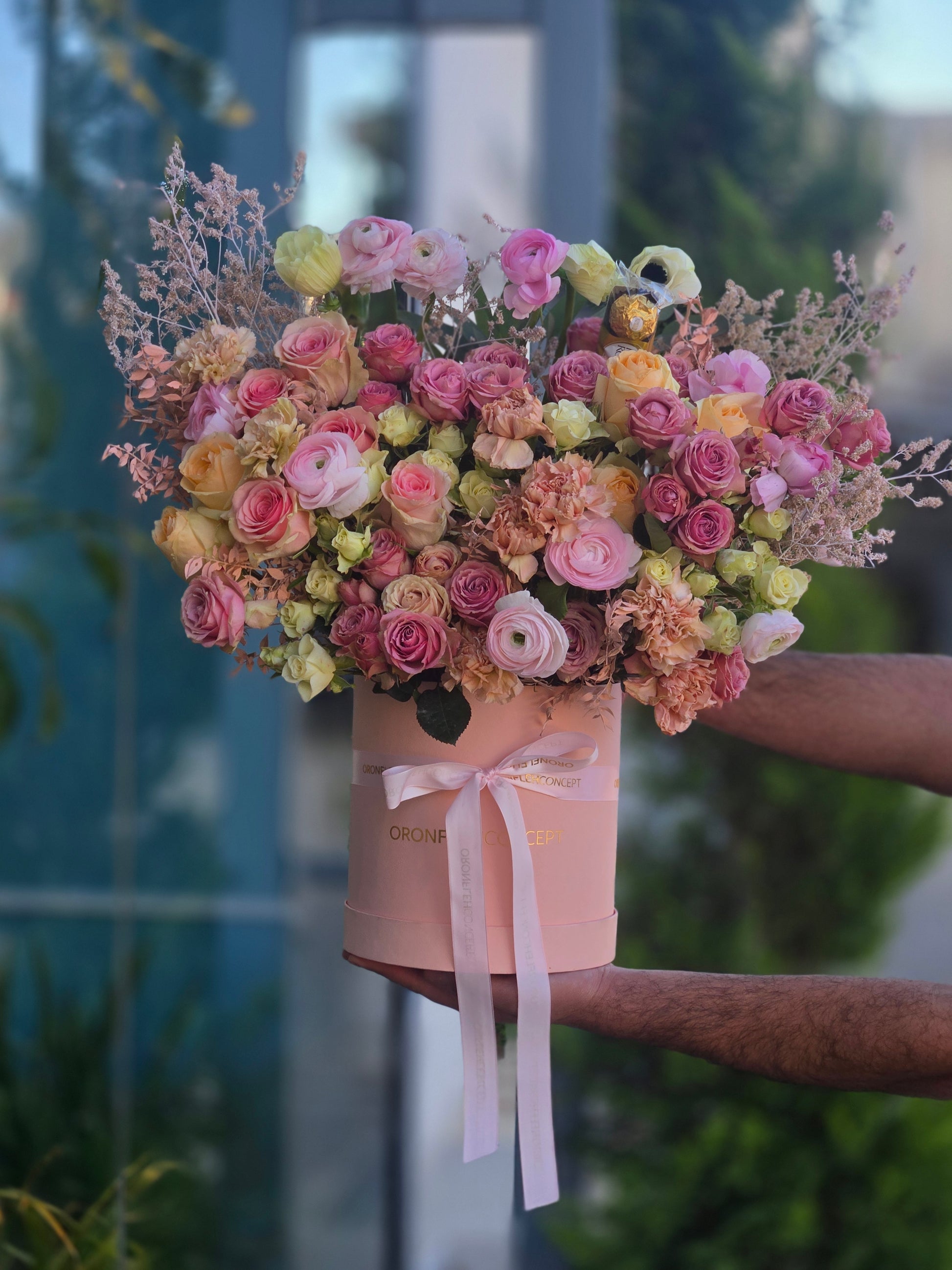 A graceful harmony of blush, peach, and soft pastel blooms arranged in an elegant hatbox, creating a luxurious and romantic statement perfect for celebrating life’s sweetest moments.