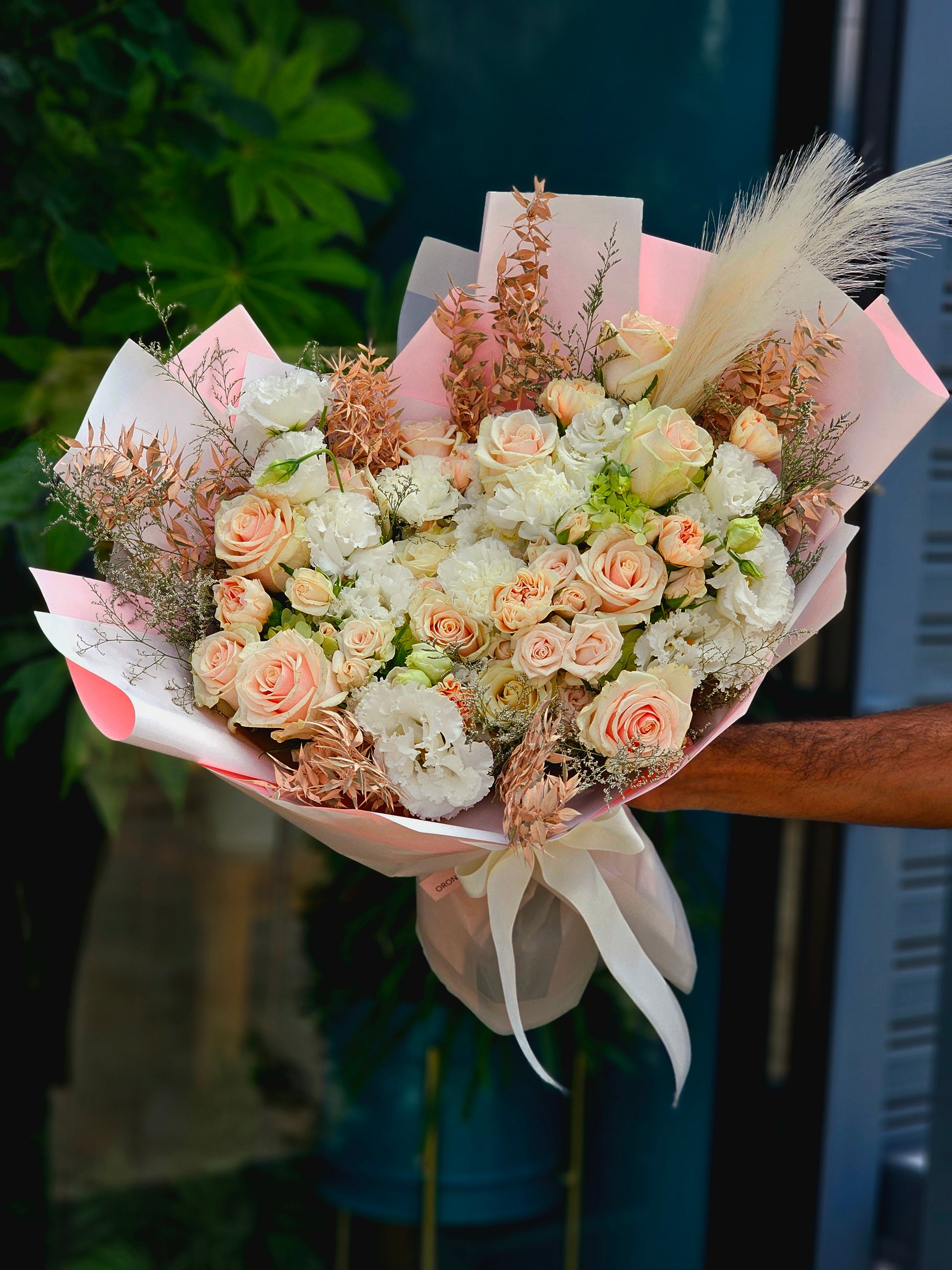 A special Bouquet pink & white Bouquet with a special touch of imported carnation for your special occasions