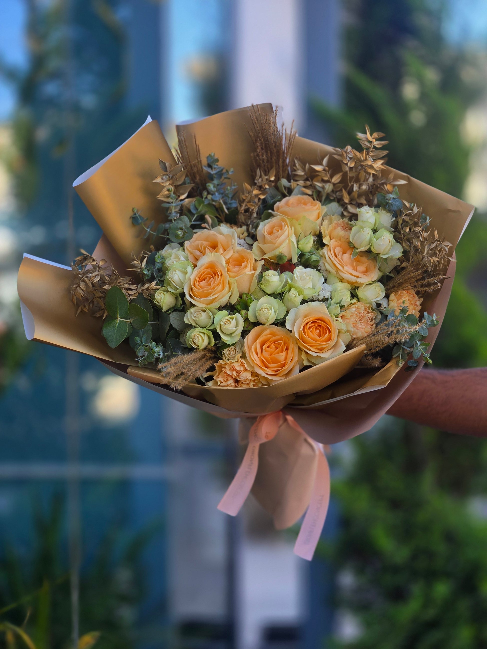 Elegant and charming, this bouquet features peach and cream roses beautifully arranged with golden accents and lush greenery. Wrapped in luxurious gold paper and finished with a satin ribbon, it’s the perfect gift for any special occasion.