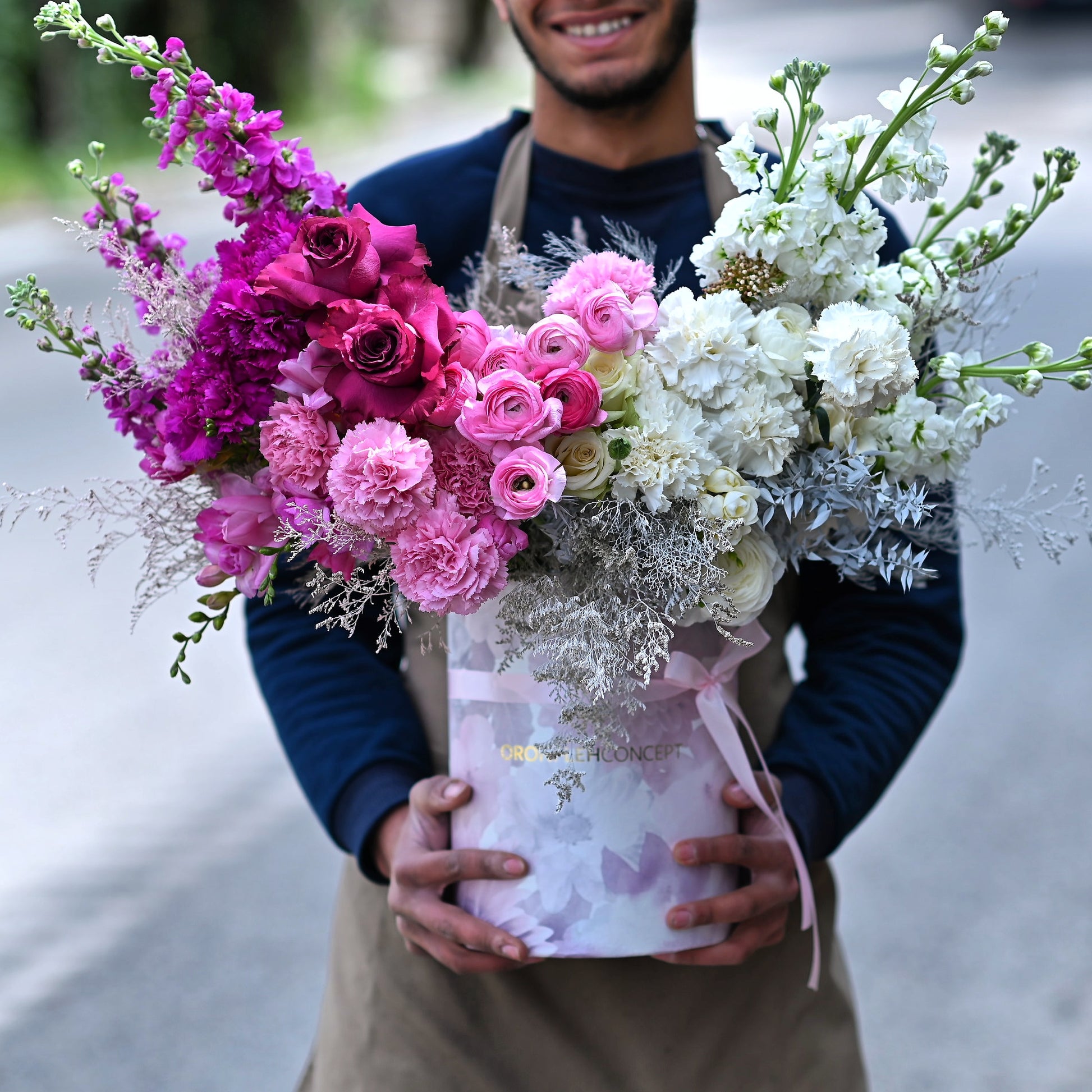 Special Flower Arrangement in our Oronfleh Concept box consisting of Wallflower, Roses, English Roses, Ranunculus, Limonium & Tulips.