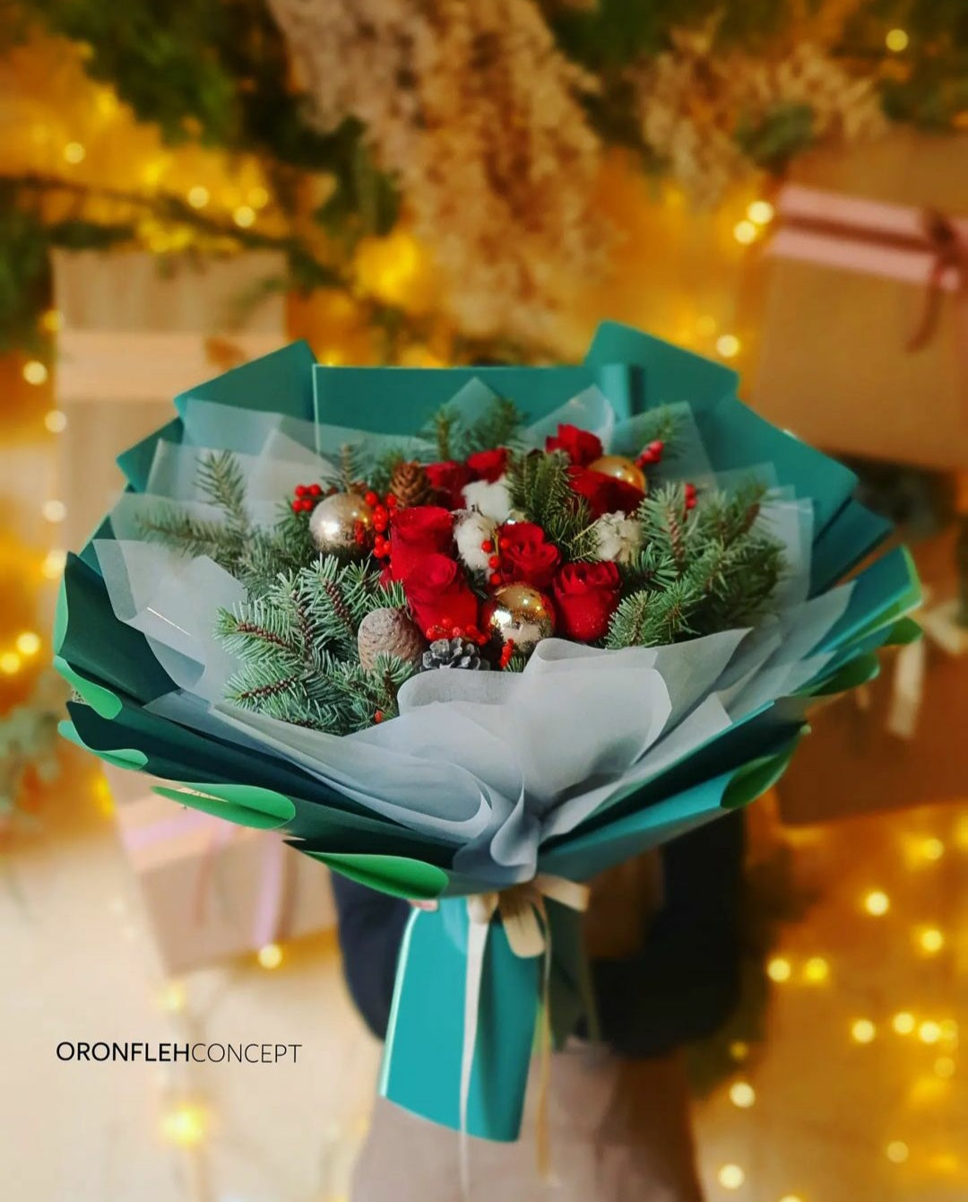 Red Roses Christmas Style Bouquet consisting of Red Roses, Fir Green, Christmas Balls & Cotton Flowers .
